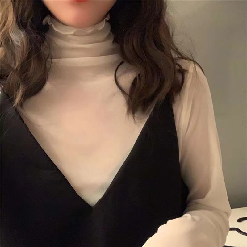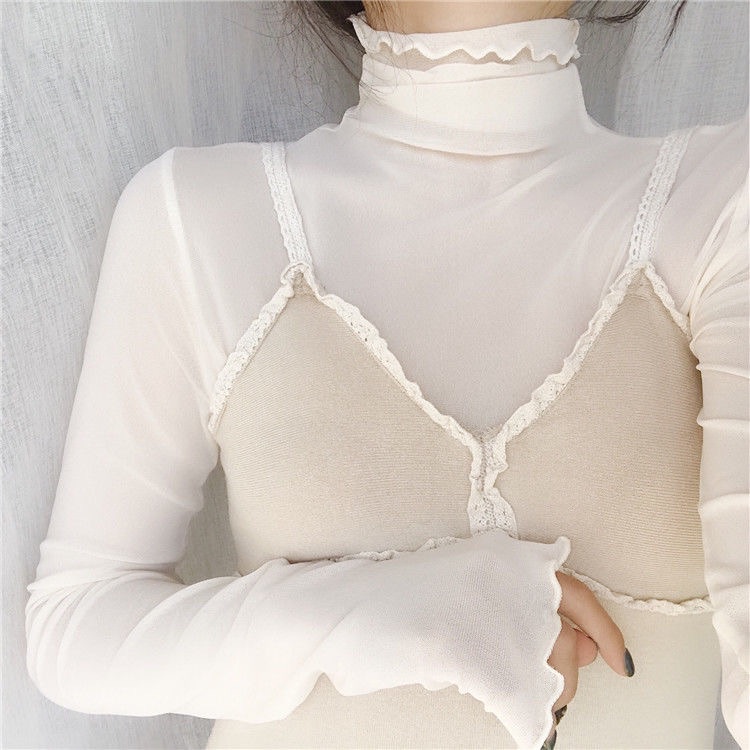 ☁️內搭王 透膚打底上衣 新款ins復古高領親膚內搭網紗上衣仙女長袖蕾絲打底衫女 女生上衣 韓國INS風