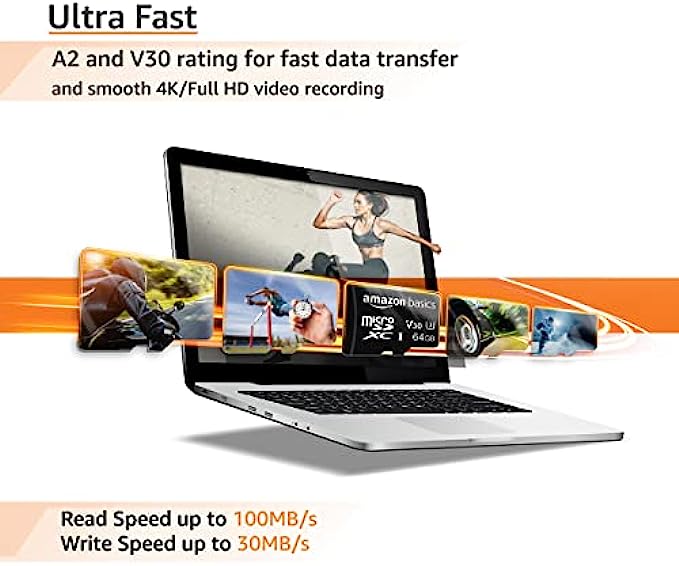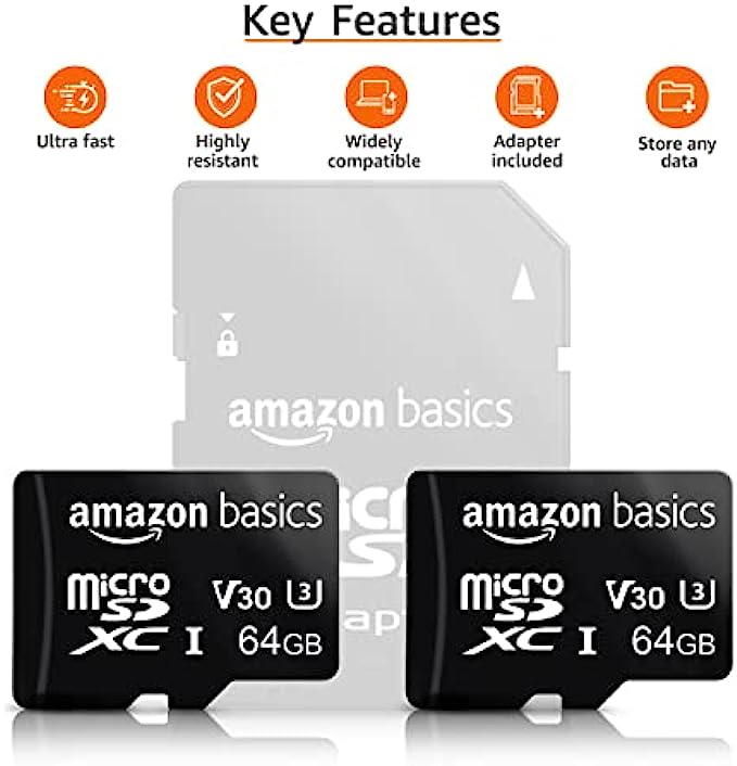 Amazon Basics microSDXC Memory Card with Full Size Adapter, A2, U3, Read Speed up to 100 MB/s, 64 GB - Pack of 2