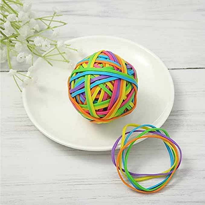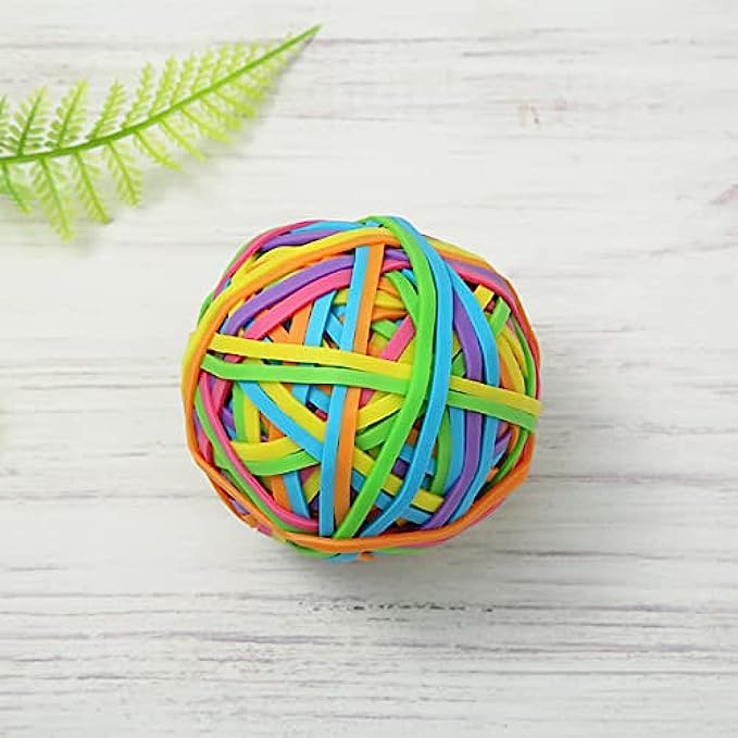 Approximately 170 bands per ball,the diameter of the rubber band is about 5.0cm,rubber bands size:Diam 50mm*width 3mm.
