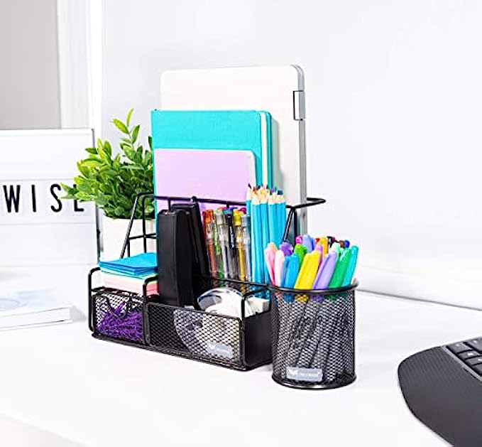 • ? Of course, you’ll be storing lots of different pens and pencils in this desk storage organizer, so we added an extra pen / pencil holder, too! Store all your bigger highlighters, markers and dry erase pens in the caddy, and smaller pens in the pencil cup for organized ‘no-struggle’ office storage.
