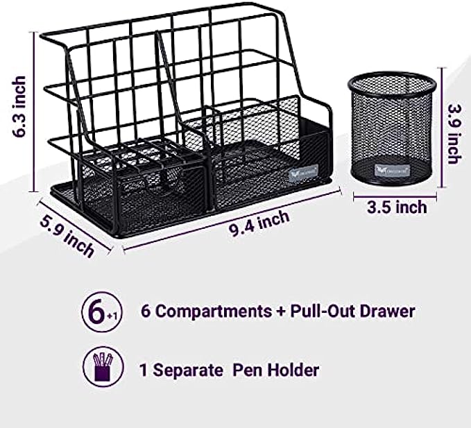 • ? No assembly required with this office decor! Just fill with all your stationery and enjoy stationary organizer for desk! It’s 47% bigger than our largest rival, but still compact for your desk - with 6+1 space for tape, erasers and phone, a drawer for paper clips, staples and pins, 2 slots for pens, pencils, rulers or scissors, a pen cup, letter tray for files, diary and laptops, and 3.34” square for standard 3” post-its.