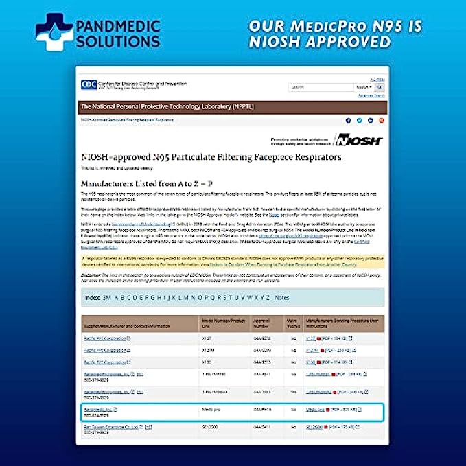 • ✅PANDMEDIC SOLUTIONS: PandMedic Solutions sells PandMedic branded surgical masks, N95 respirators, and other products. We also manufacture medical products for other medical brands. PandMedic’s N95 respirator mask is approved & cleared for use in healthcare and construction settings by NIOSH