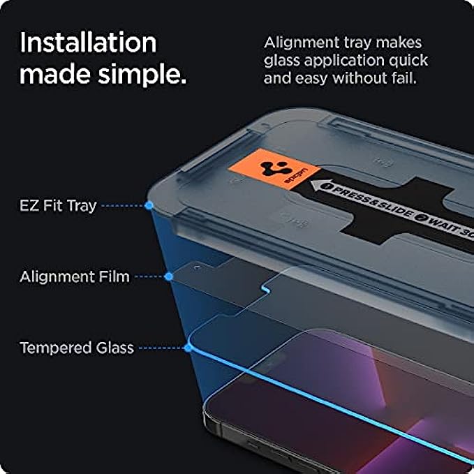 Tempered glass durability rated at 9H hardness (2 Pack) Includes an innovative, auto-alignment installation kit for effortless application Glass protection that frames the physical screen for a clean finish Oleophobic coating for daily fingerprint resistance Made case compatible with every Spigen iPhone 13 Pro Max case Specifically Engineered to Fit iPhone 13 Pro Max / iPhone 13 Pro Max Screen Protector