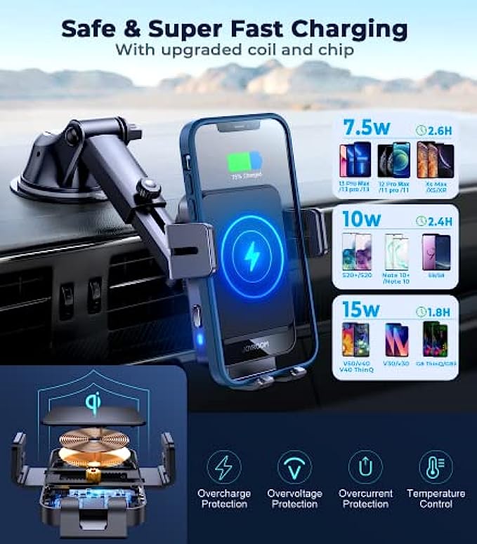 • ? 【Super Stable Base】Joyroom phone mount for car wireless charger's base is equipped with a powerful suction cup and professional 3M adhesive (high temperature resistant). The base's suction cup has been tested thousands of times, it can absorb more than 20 pounds of objects without dropping. Even if passing speed bumps or driving on mountain roads, you don’t need to worry about it falling. In addition, the bracket arm and clip are equipped with silicone pads for anti-slip and anti-vibration.