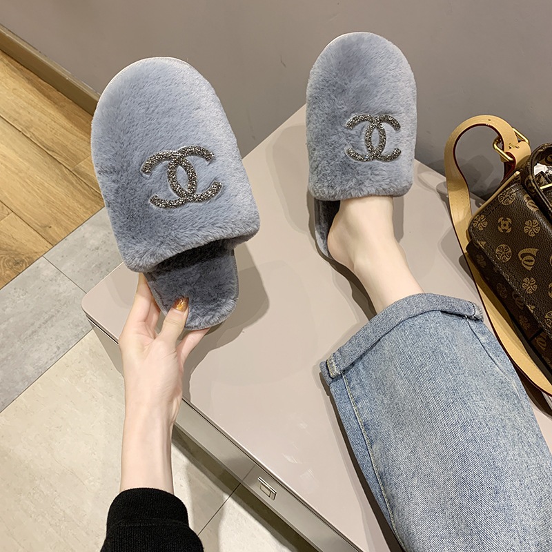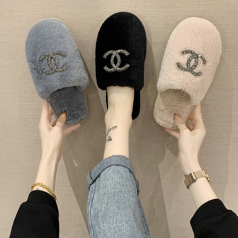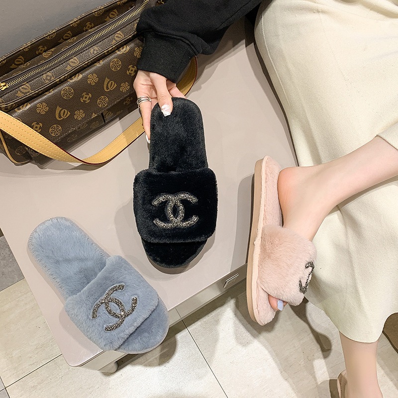 Fashionable Fur Slippers With Horizontal Bands And Soft Soles For Indoor Outing C-228